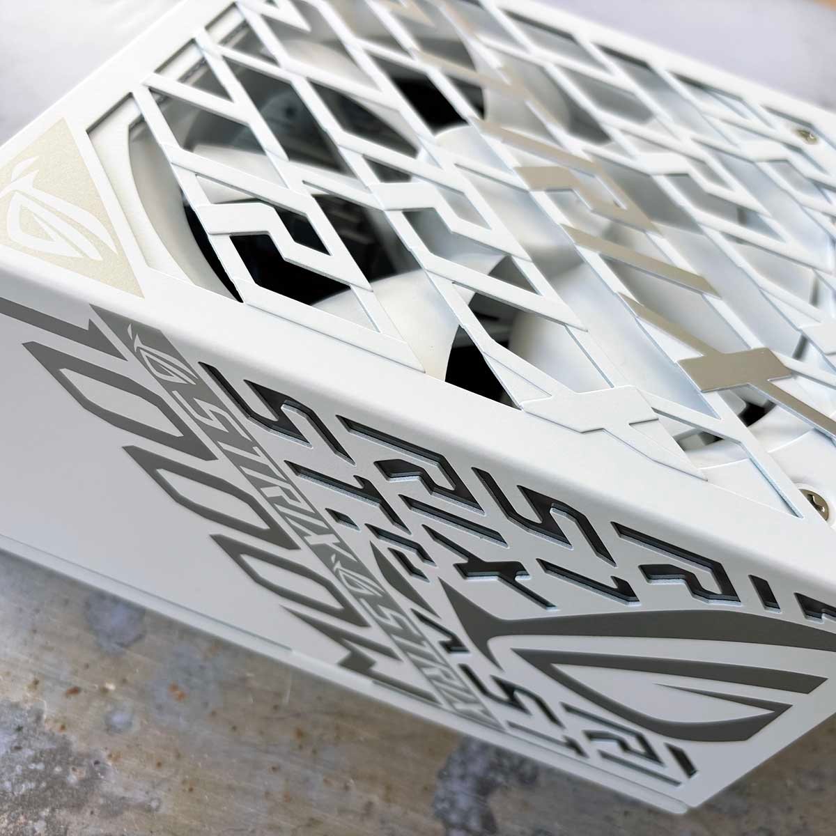 Though many modern chassis routinely hide PSUs behind dedicated compartments in the name of aesthetics and clean lines, Asus’ efforts at constructing a first-class supply are laudable. This is one unit that wants to be shown off in your ice-white build. The colourway is consistent across the casing, and I do like the extra effort that’s gone into personalising the PSU. Peer closely to see the Strix logo above the fan, which itself sits in an internal frame. Looking distinct enough on first blush, Asus bundles additional stickers that add visual flourish.