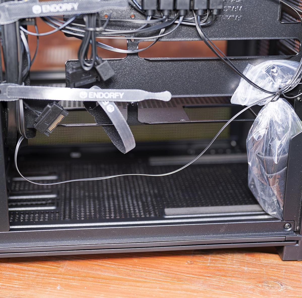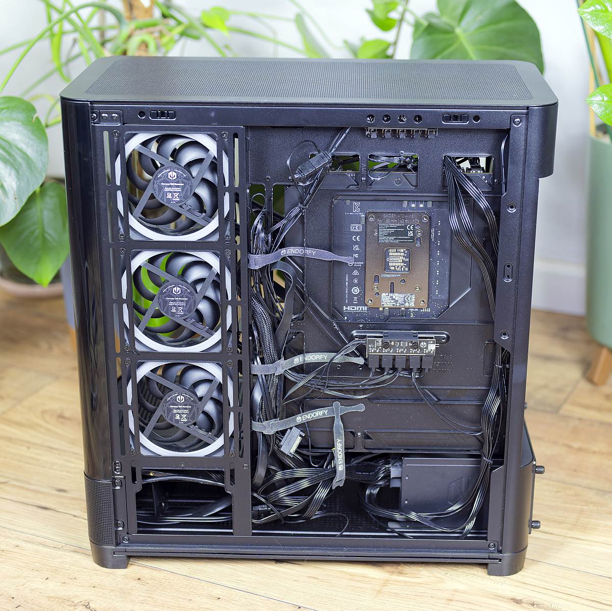 The rear of the motherboard tray has plenty of space for cable routing, and the additional tie-down points make clean installation easier. That is especially useful in a glass-heavy chassis, because every visible cable run has a bigger impact on the final presentation.