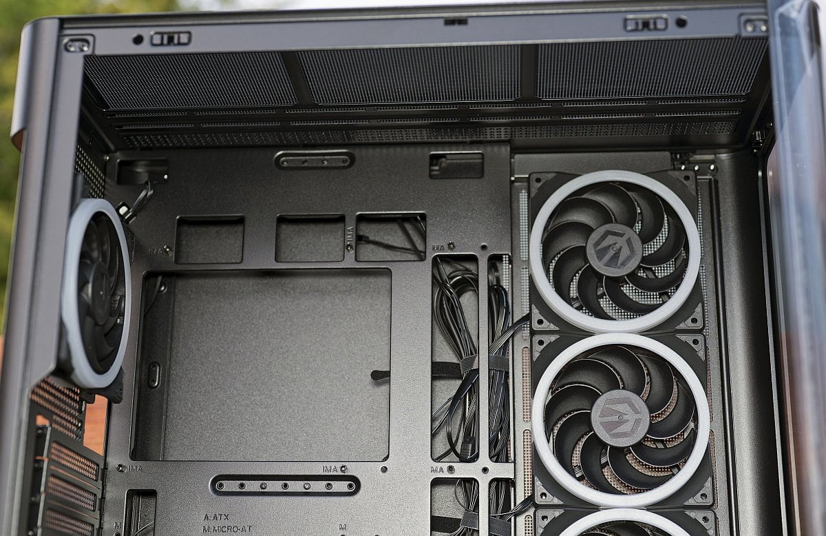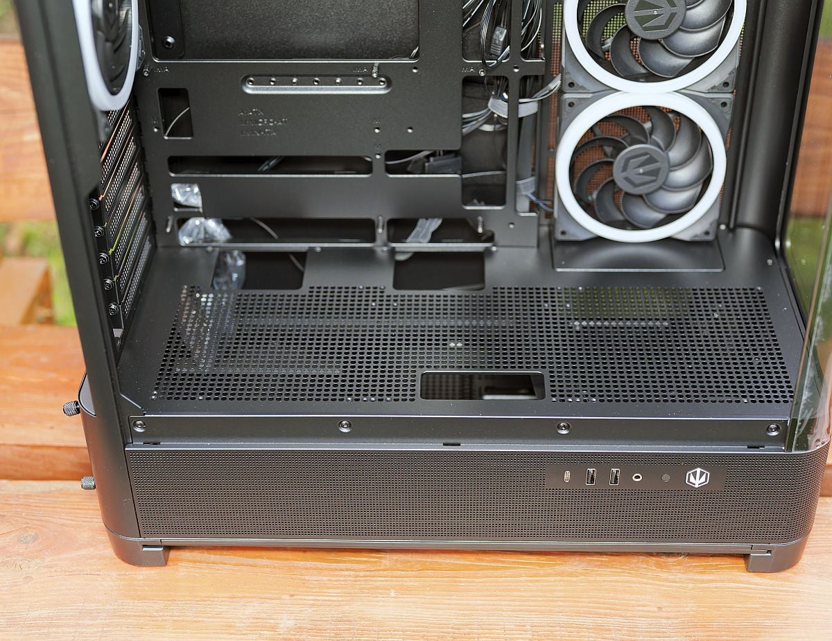 The main chamber is dominated by a wide motherboard tray with plentiful cutouts, though without rubber-grommeted passthroughs, which is likely a cost-balancing measure. There’s a spacious GPU area that easily accommodates triple-slot cards without blocking front-to-rear airflow.