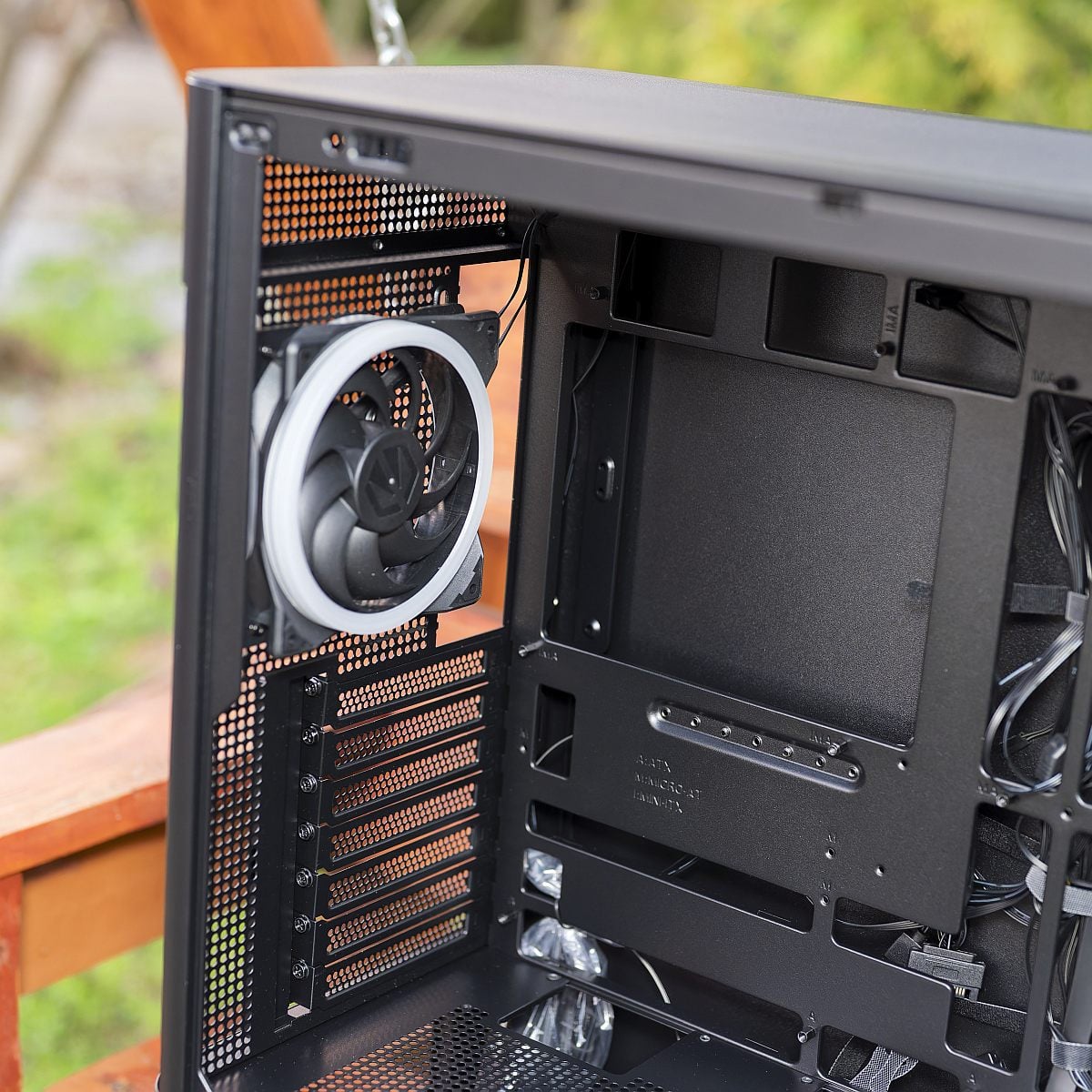 The PSU mount is removable. You can also see one of the four pre-installed 120mm Corona ARGB fans and seven expansion slots.