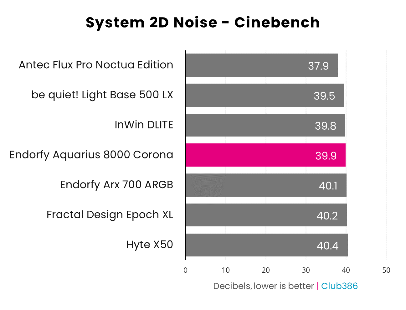 At idle, the Endorfy Aquarius 8000 Corona is practically silent, with noise rising only during intensive gaming or rendering, mostly from the GPU cooling.
