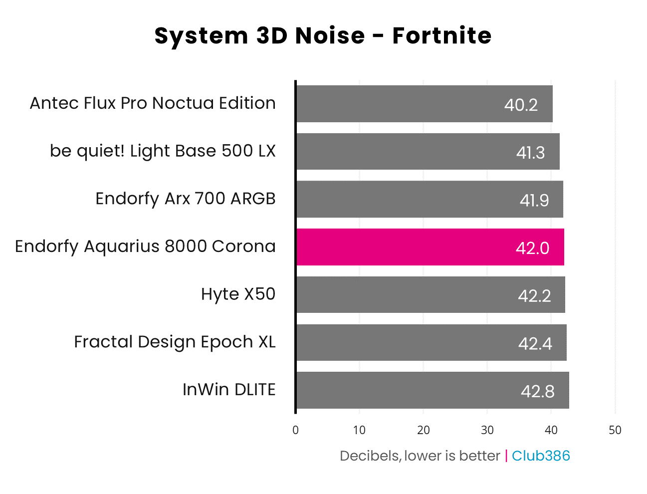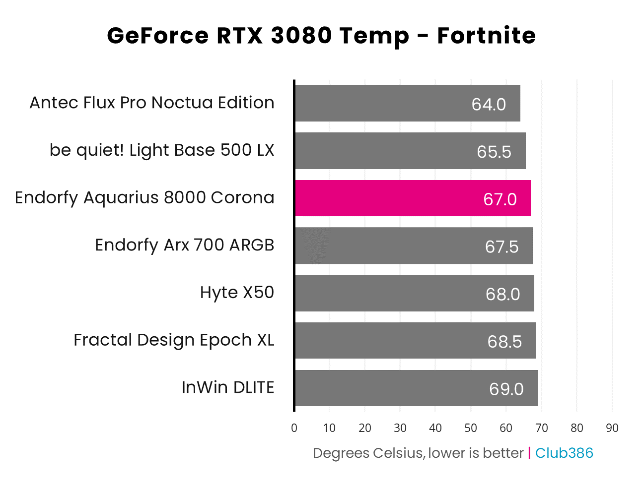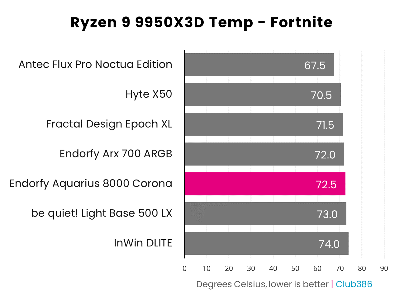 The charts below show Endorfy Aquarius 8000 Corona’s thermal performance compared to other cases. Temperatures were recorded in idle and under 2D and 3D loads using Cinebench 2024 and Fortnite, respectively.