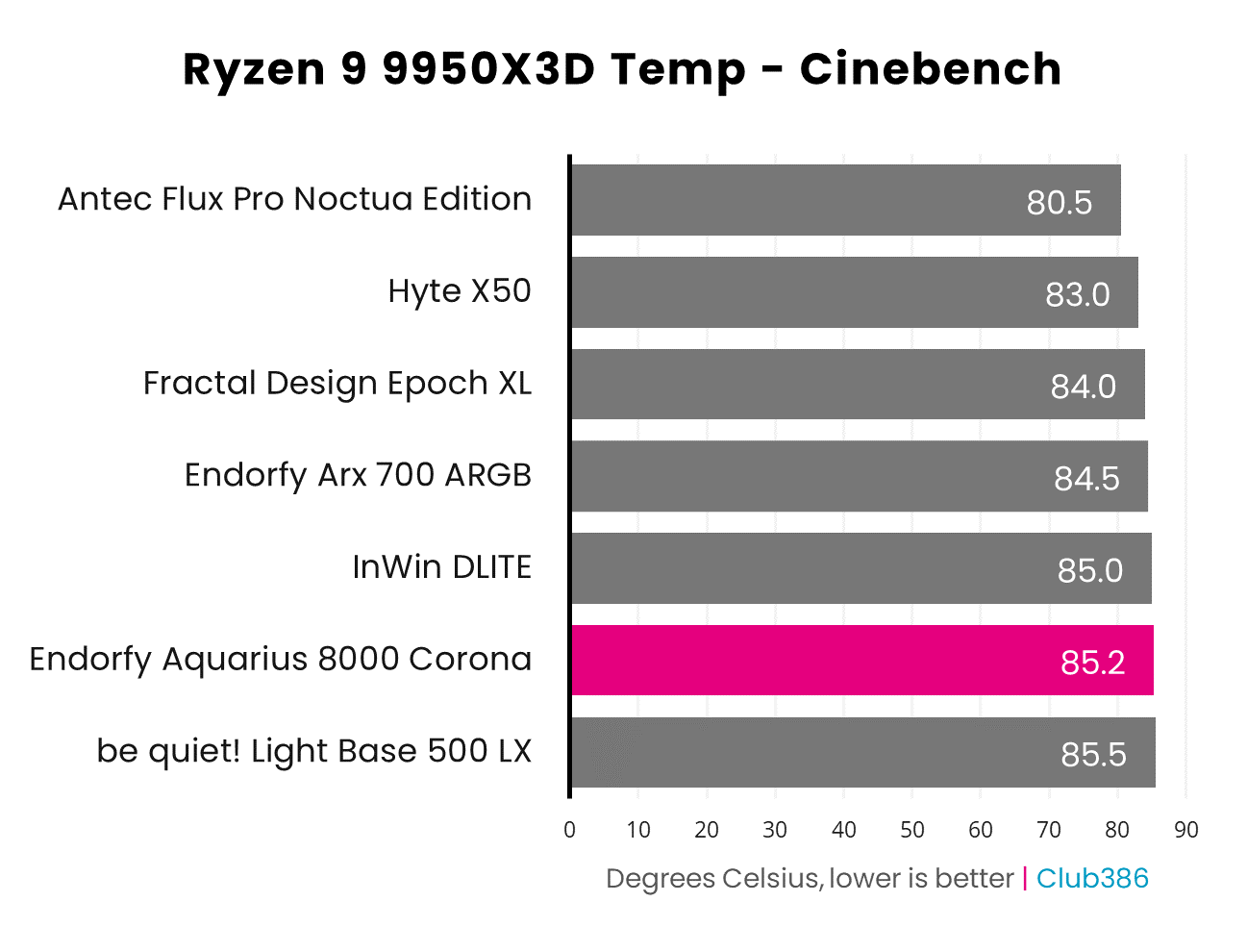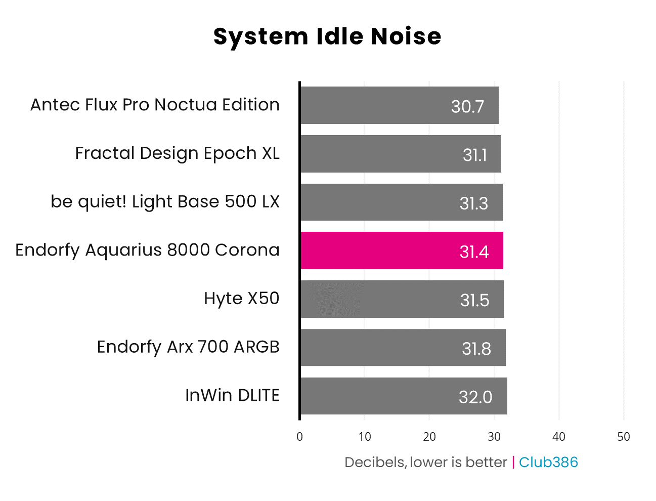 Thermal performance of the Endorfy Aquarius 8000 Corona compares favourably with that of other mid-tower competitors. CPU and GPU temperatures remain in check, aided by the mesh intake and four pre-installed fans. Adding a rear exhaust would be the simplest way to further expel hot air from the cavernous interior.