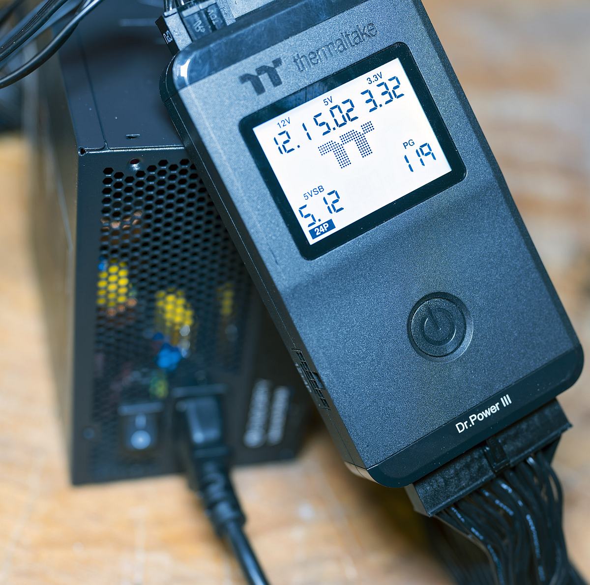 My first basic test is performed with a power-supply tester. It doesn’t draw more than a couple of watts from the PSU, but it helps determine whether the PSU is operational. A self-check indicates whether the voltages are at the proper levels.