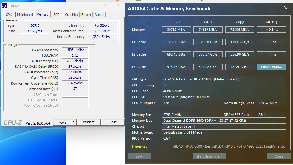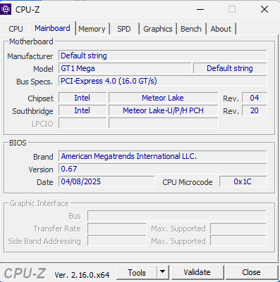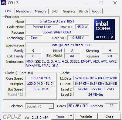 As I mentioned, the Geekom GT1 Mega features a 16-core, 22-thread Intel Core i9 185H CPU with integrated Intel Arc graphics. At first boot, you’ll need to complete the Windows 11 installation by setting the language, keyboard layout, and other necessary settings, but that’s always the norm. Then, it’s always worth checking CPU-Z to see if everything is showing what it should: