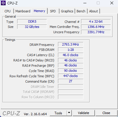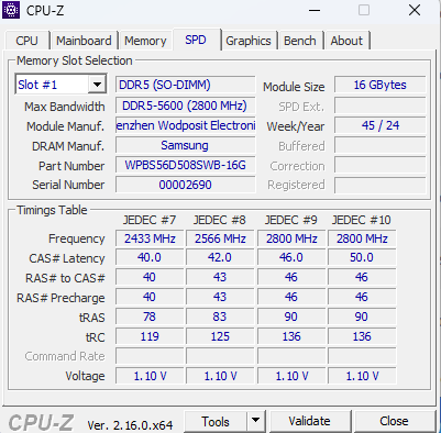 The DDR5 RAM provided here works at 5600 MHz, with CL46/45/45 timings. Happy days.