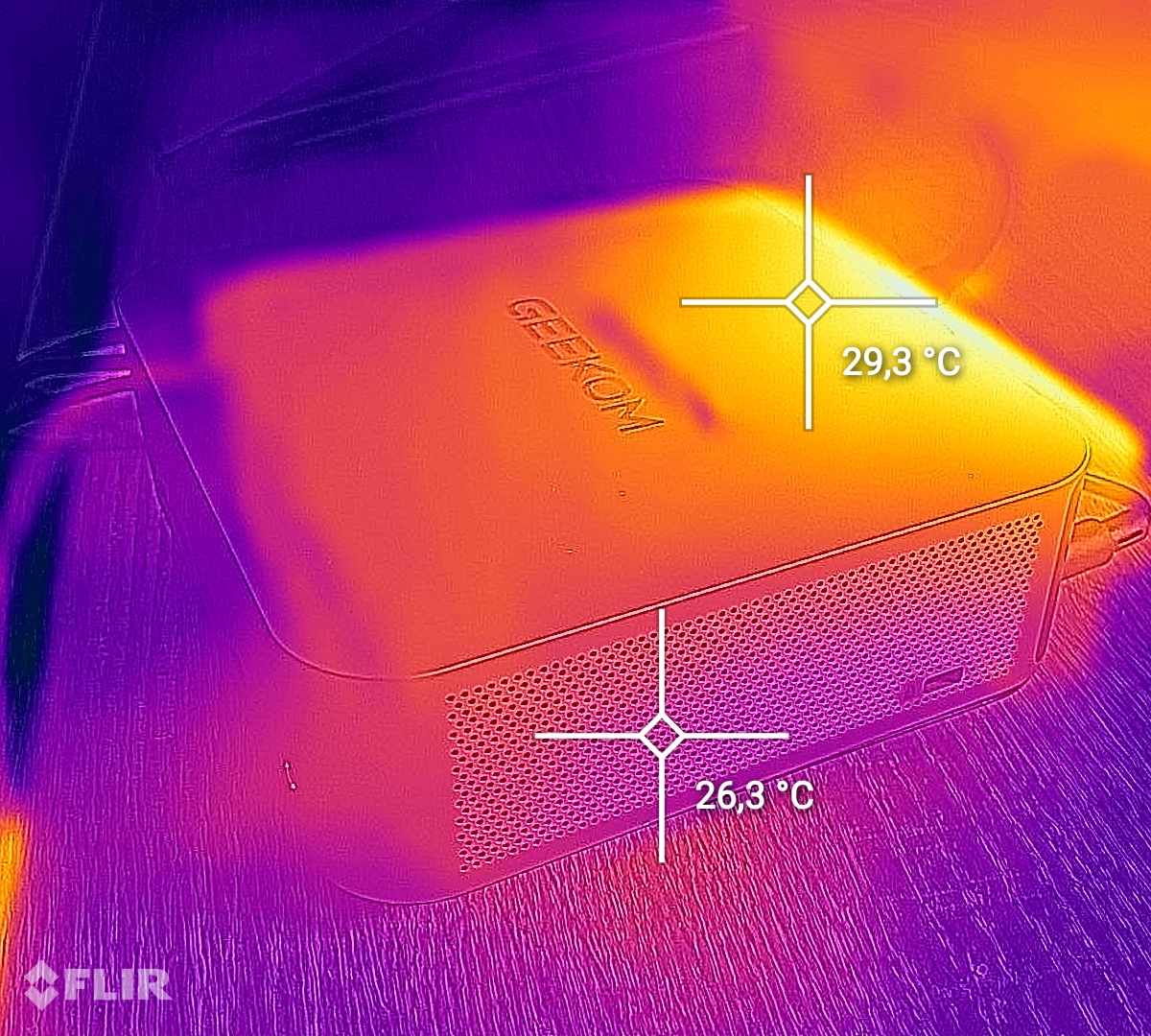 The Geekom GT1 Mega balances compact size and strong performance, but this comes with moderate fan noise under sustained load. Again, I measured the following: