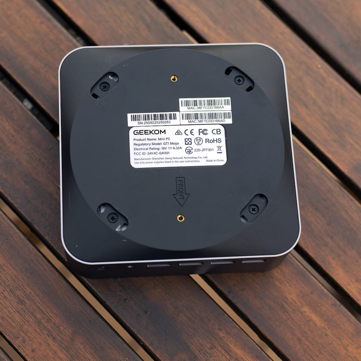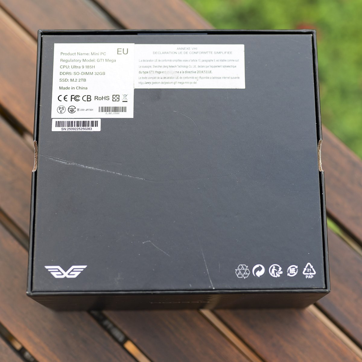 The Geekom GT1 Mega arrives in a sleek, well-padded black box. It makes a very positive first impression. A full configuration label on the underside makes it easy to verify the specs of the following components: CPU, RAM, and SSD, right out of the box.