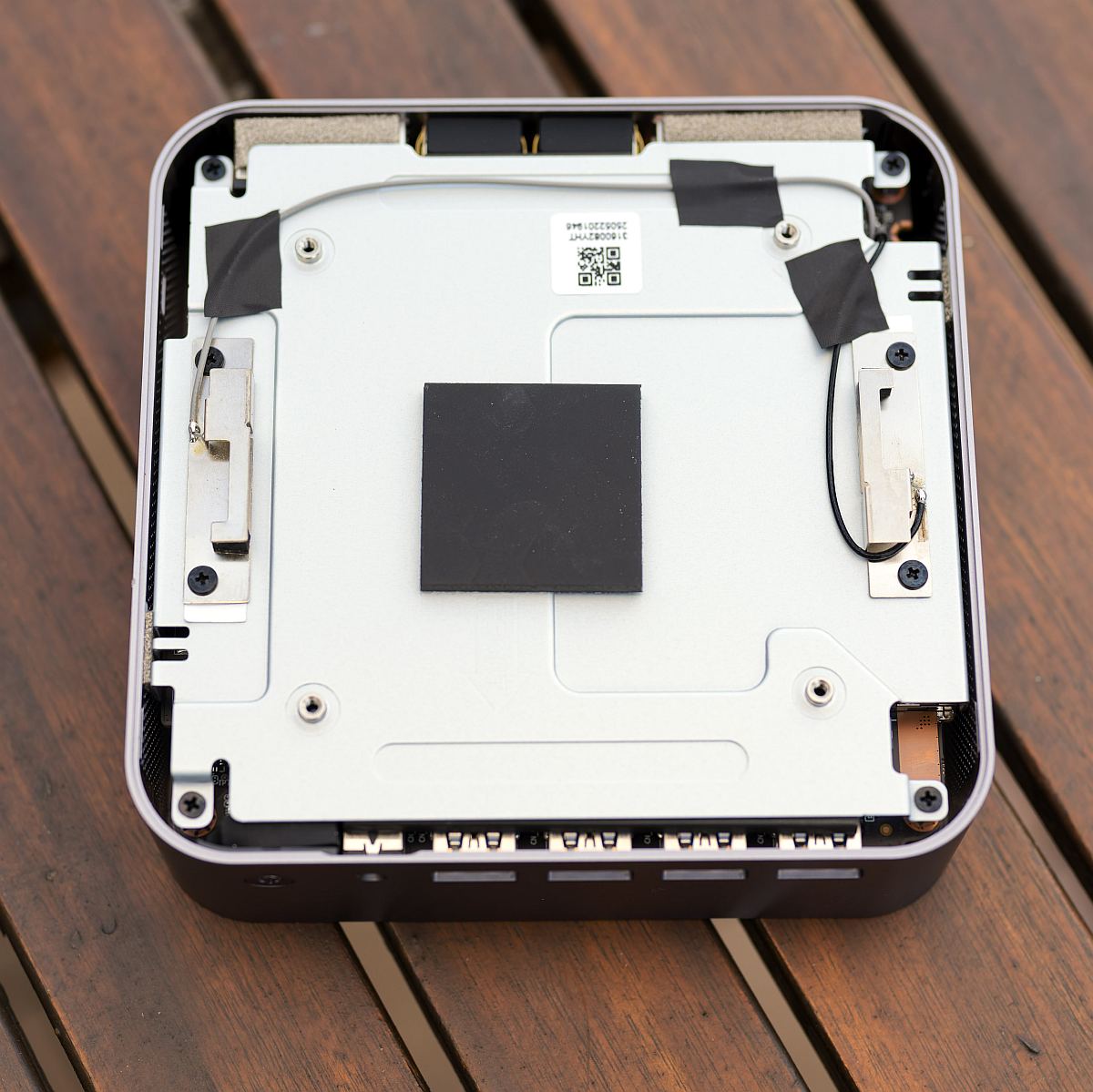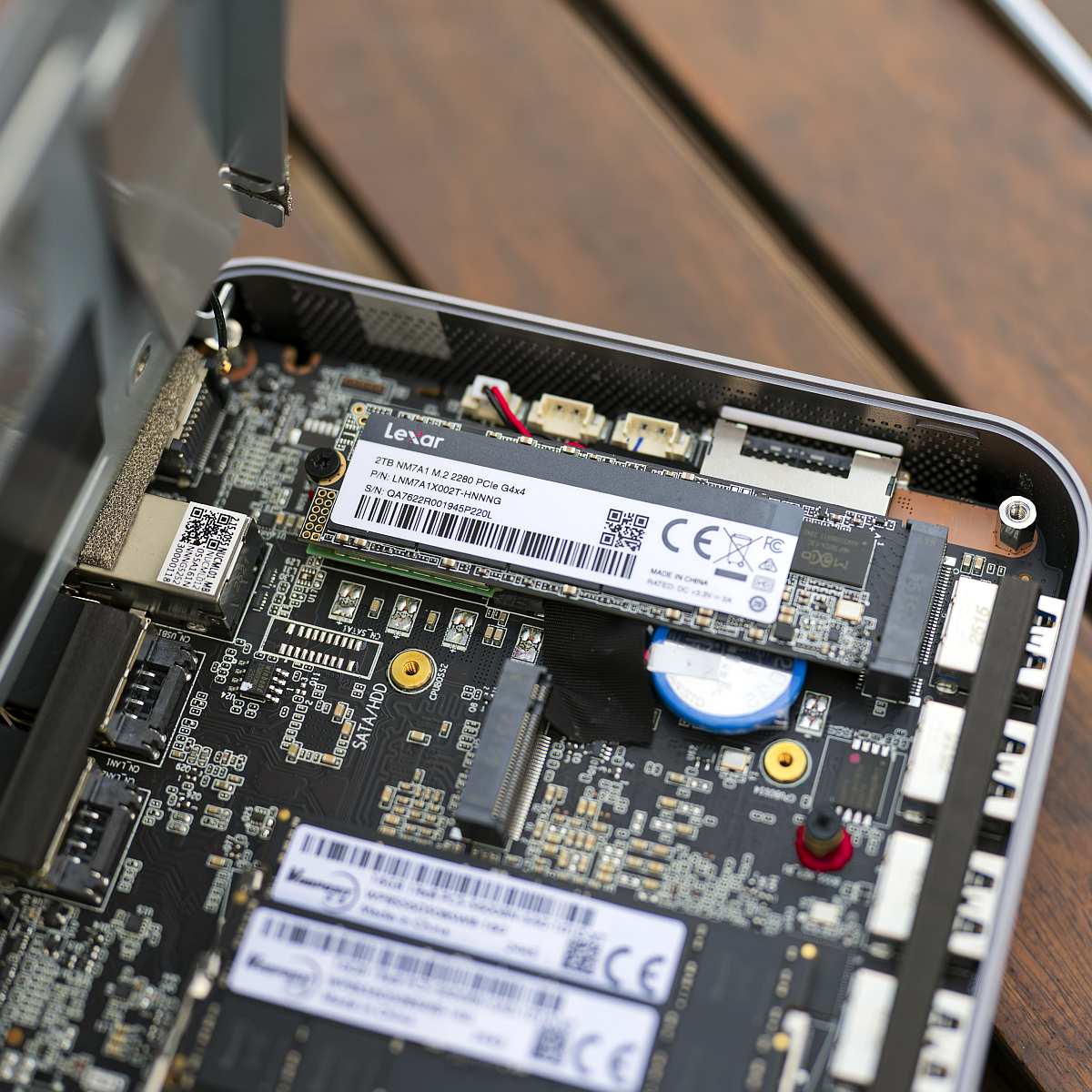 After removing the top cover, you can see the cooling system. At the bottom of the chassis, you can find information about the model, the required power, and the manufacturer. Slipping the bottom cover off requires undoing four screws, which allows you to see the 2 TB Lexar NQ7A1 SSD (LNQ7A1X002T), which is specced with performance up to 6,000 MB/s read and 5,000 MB/s write that’s typical for a PCIe Gen 4 x4 NVMe SSD. There’s additionally a space for an optional M.2 2230 drive.