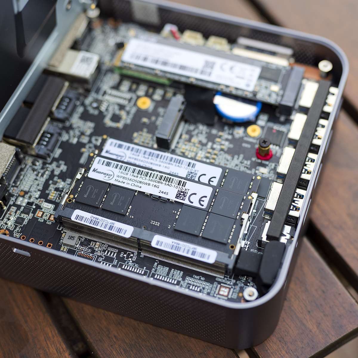 The two DDR5 modules, from Netac (WPBS56D508SWB-16G), operate at 1.2V with a frequency of 5,600MHz and CL46 timings. There’s a cooling and a thermal pad for the M.2 2280 drive attached to the bottom cover.