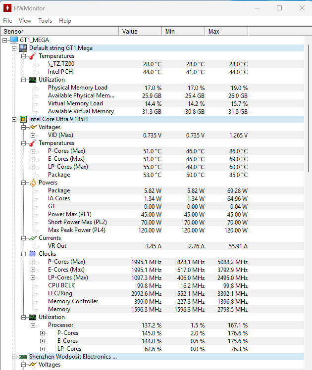 Temperatures under load typically stay in the 70-80°C range for the CPU, which is safe and normal for this class of device. Under a heavy load, it can reach as high as 90°C. Below is the HWMonitor, showing temperatures of up to 86°C during a Cinebench 2024 run.