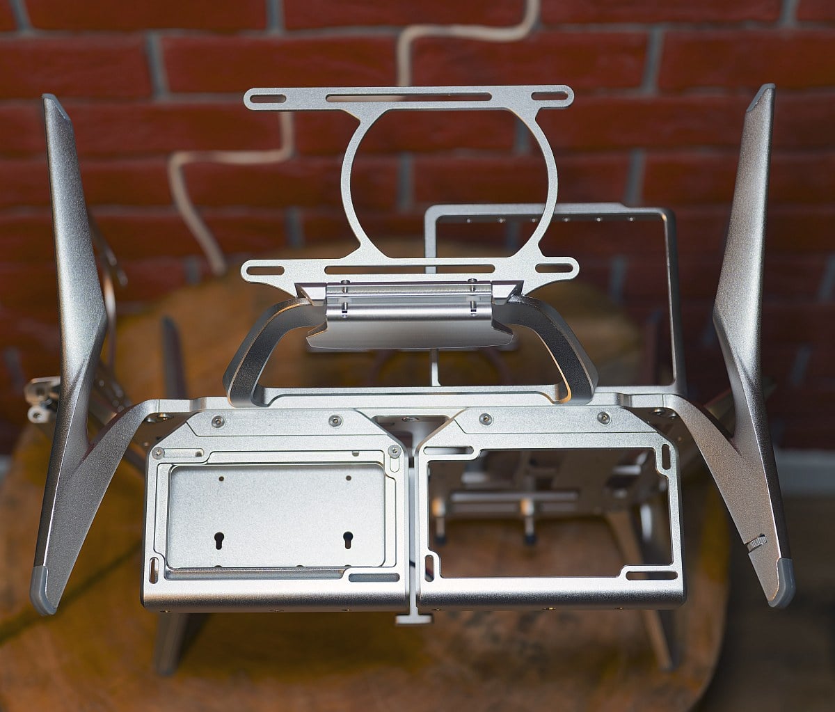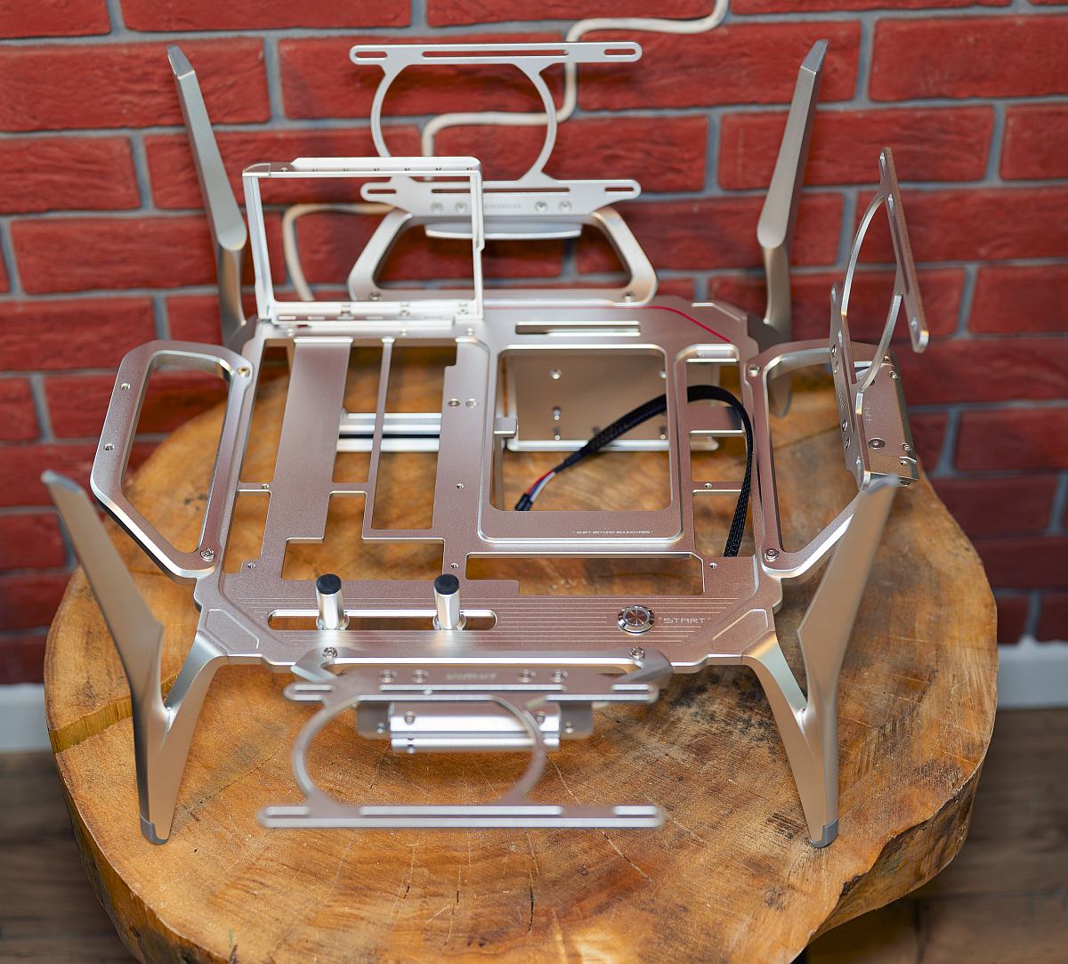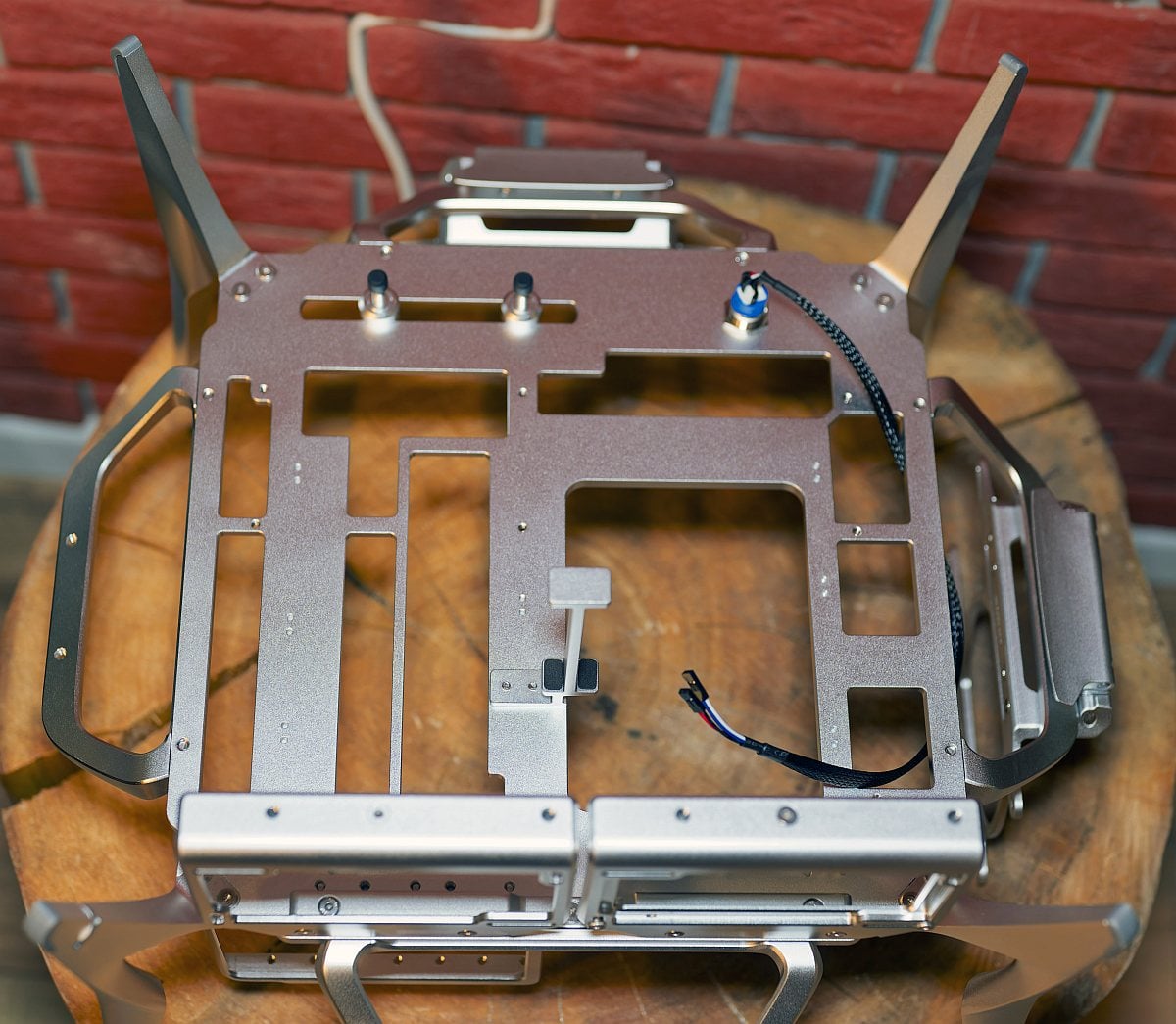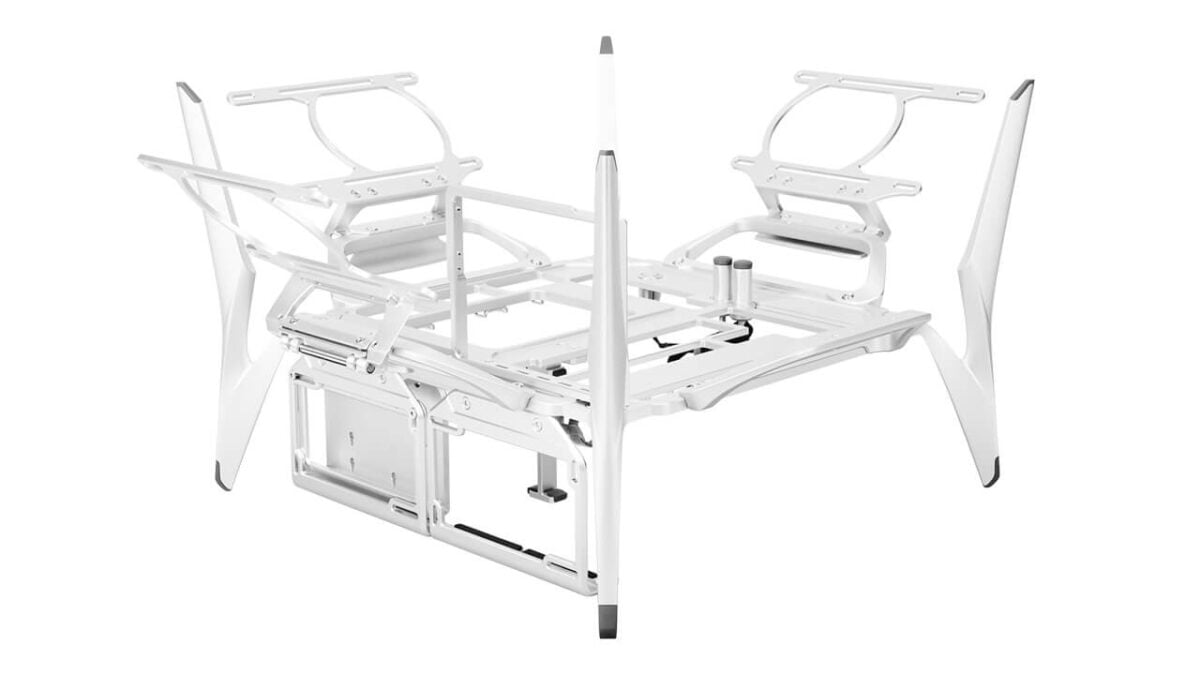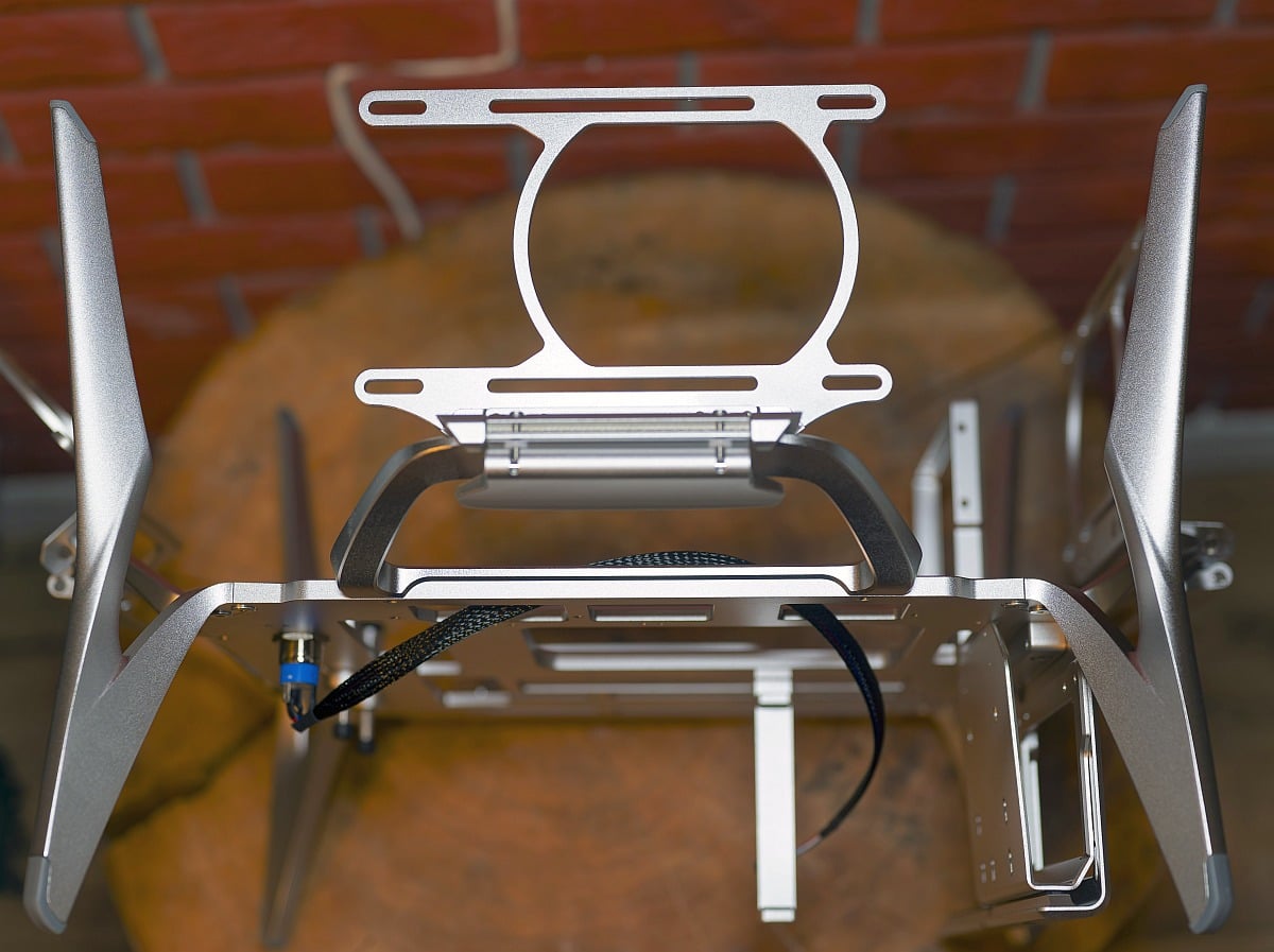 The Shift is an open‑frame, desk‑sized chassis that can contract for a neater footprint or expand dramatically once its wings are spread. Despite its size, the aluminium construction keeps the weight modest while remaining rigid in use.