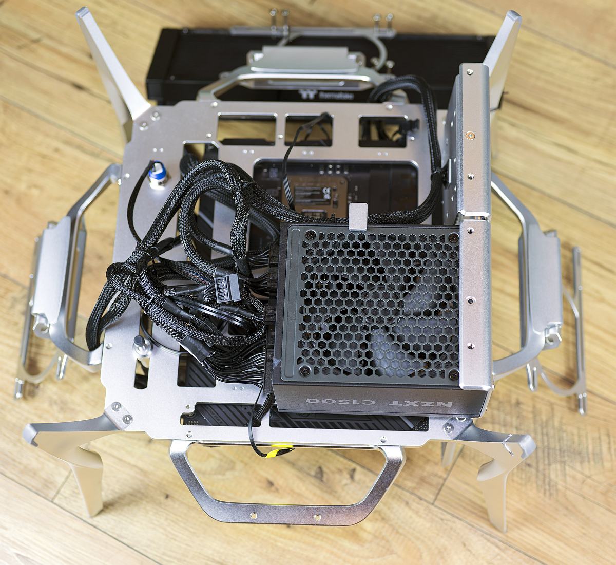 The NZXT C1500 PSU typically requires careful placement due to its length and cable bulk. Here, the movable brackets and numerous cutouts enable routing thick bundles cleanly behind the tray.
