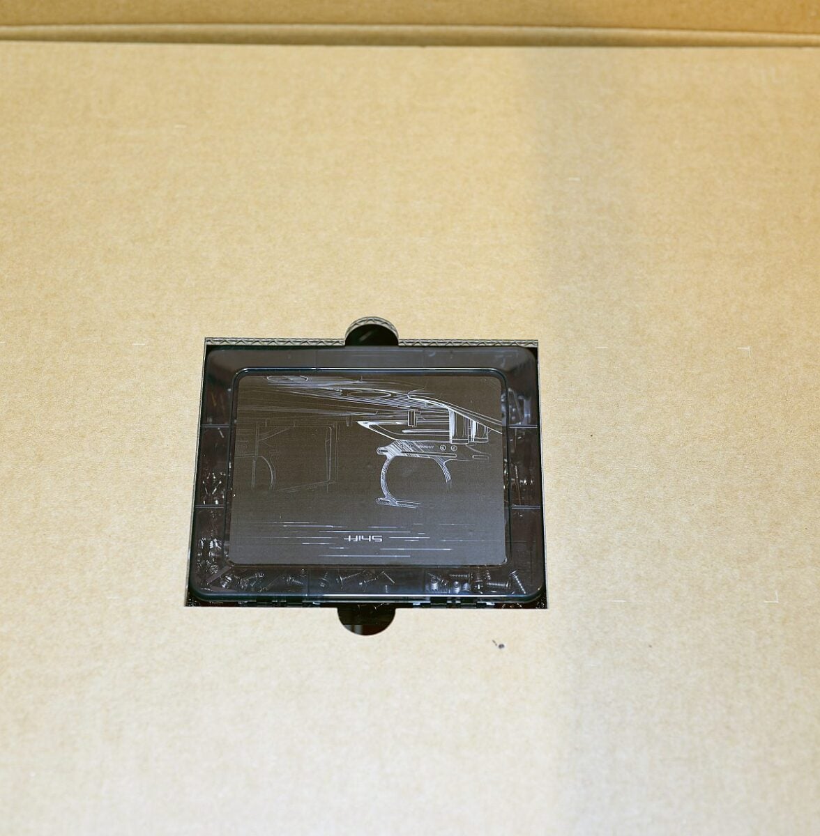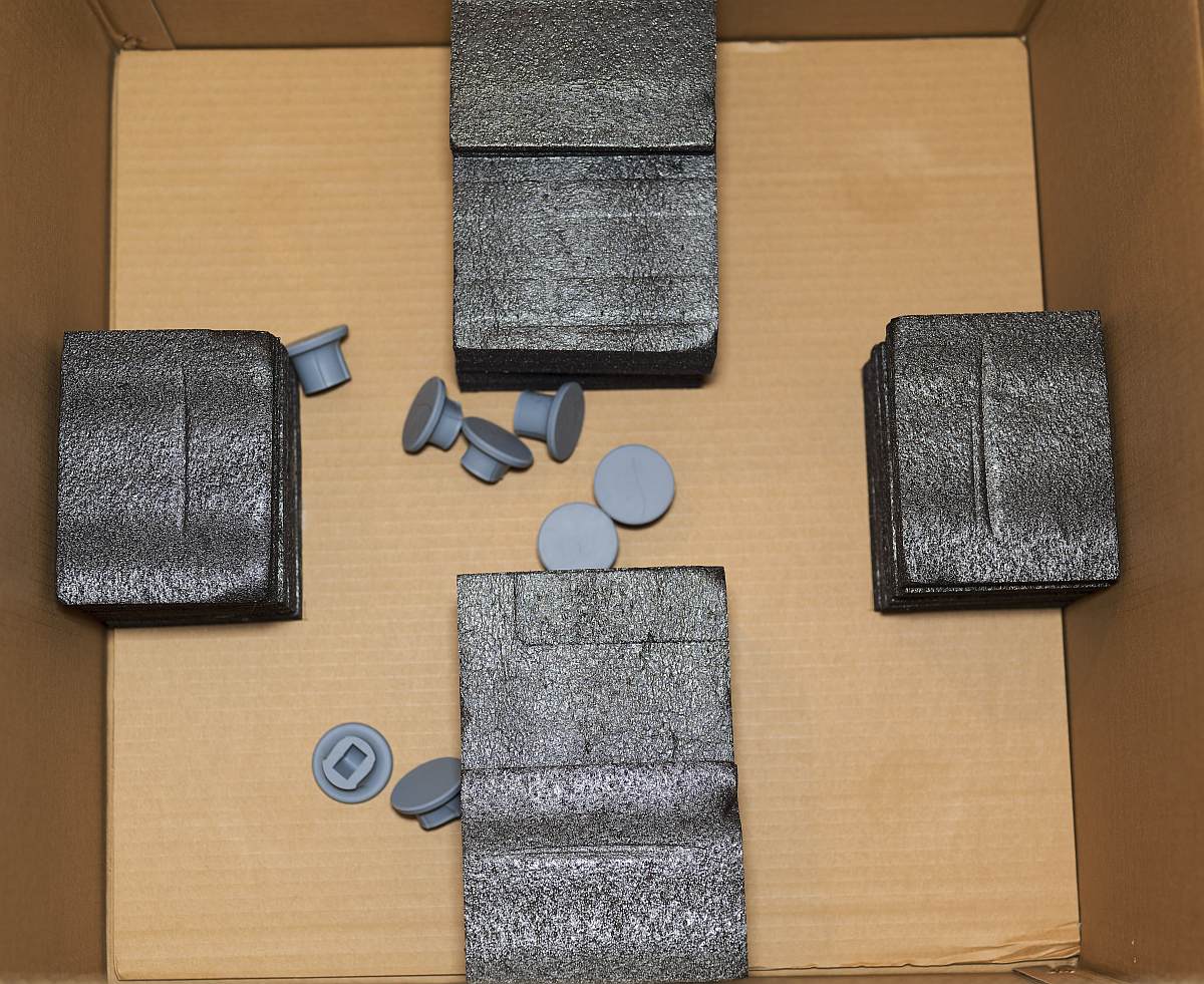 A flat cardboard insert with glued open‑cell foam sandwiches the chassis from above and below. It keeps the open frame from moving within the box.
