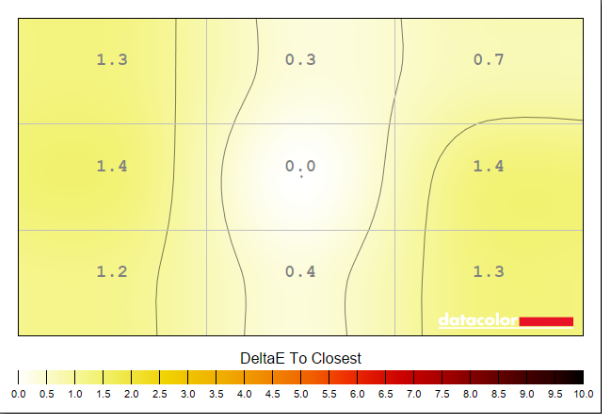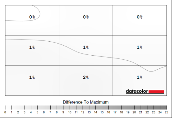 Colour uniformity is practically flawless on the MAG 272QPW X28, with a negligible 1.4 Delta E at most relative to the centre of the screen. Luminance is similarly excellent, peaking at a minor 2% deviation.