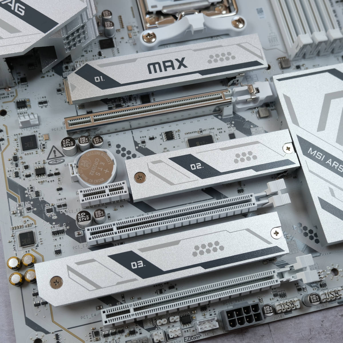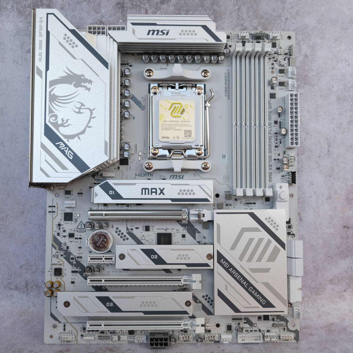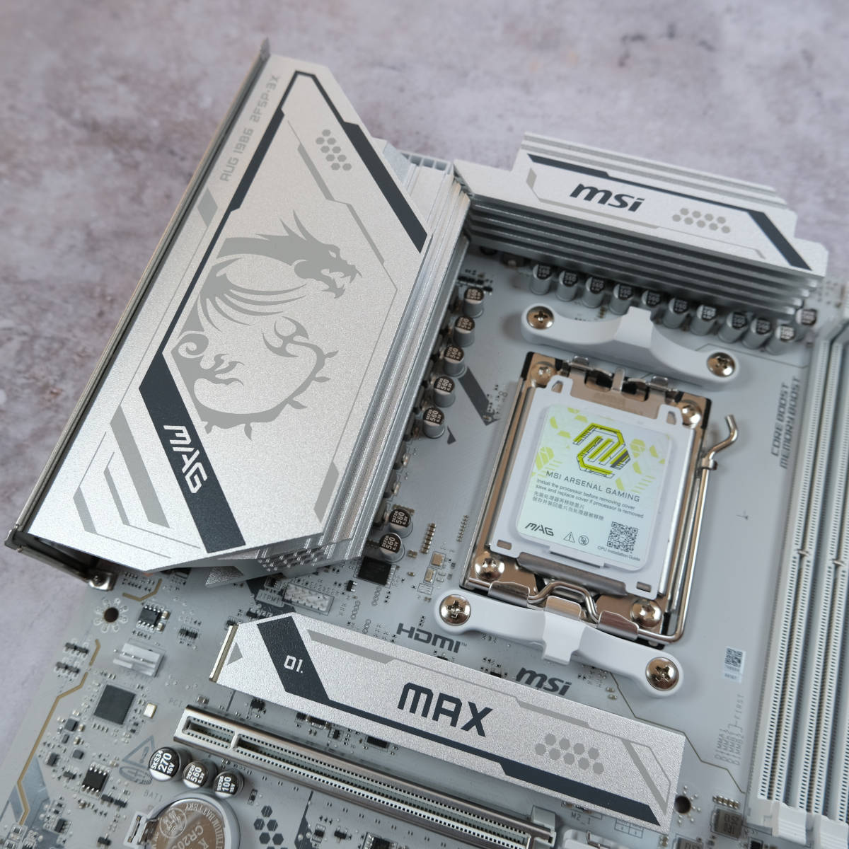 This new board arrives with a white PCB, complete with grey accents and MAG badging