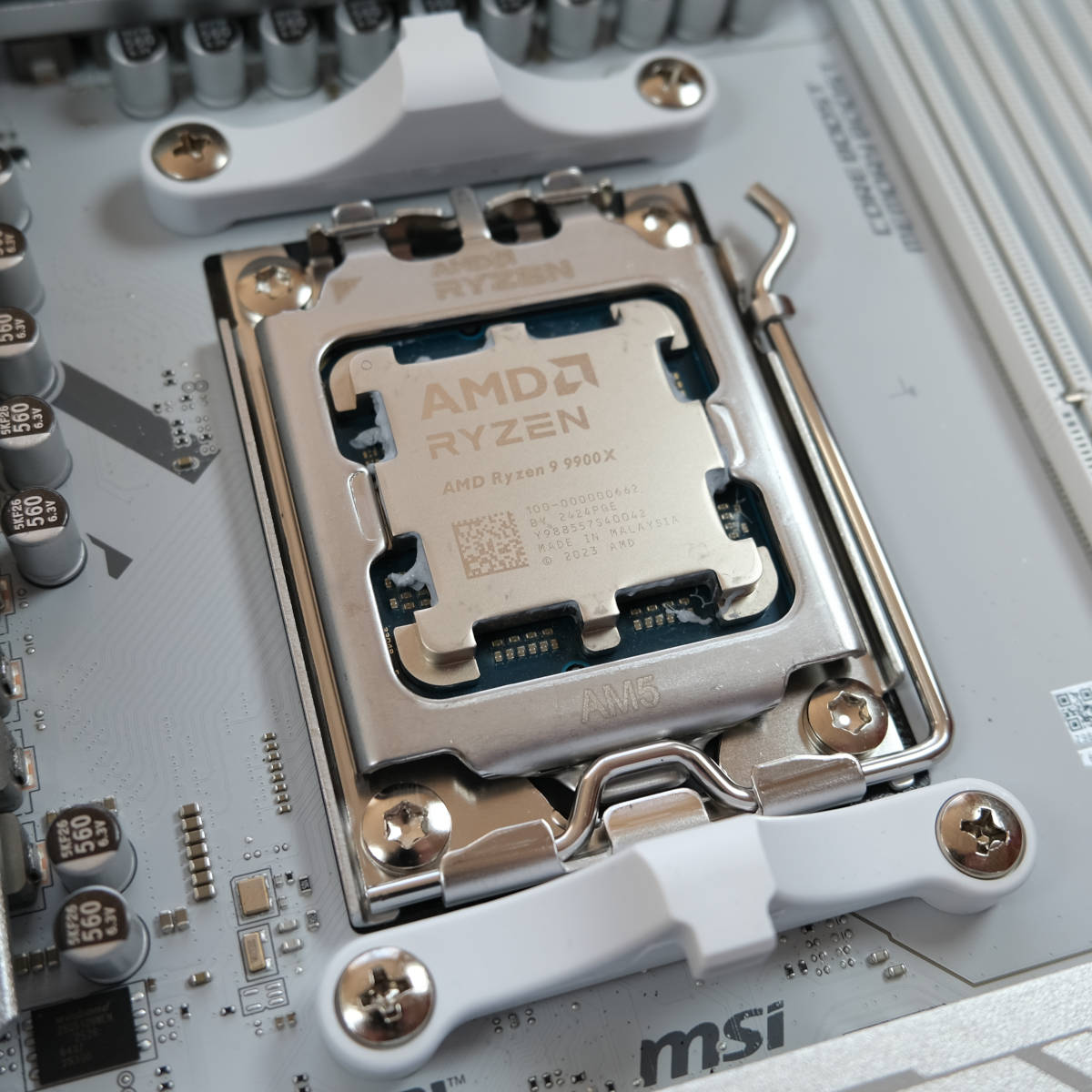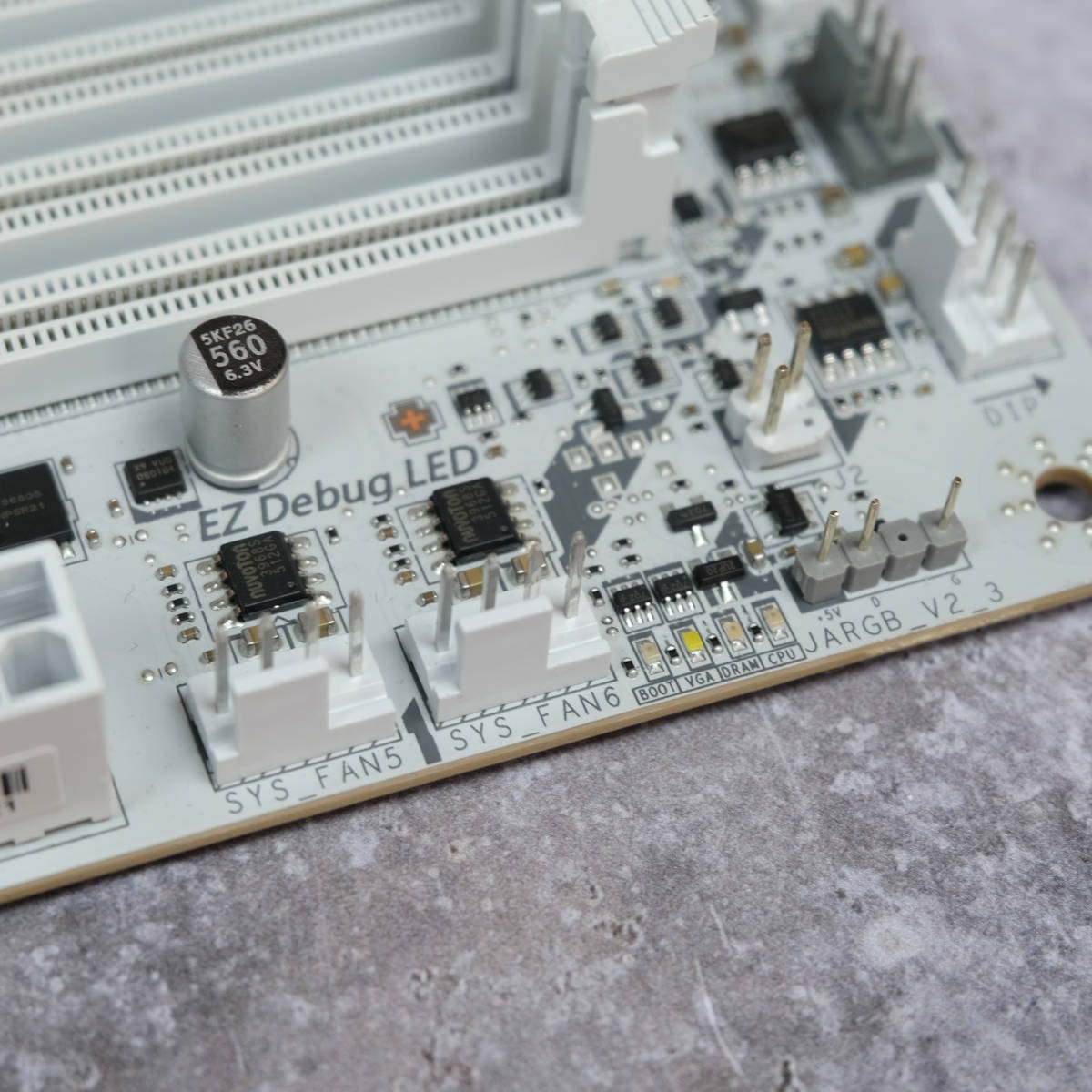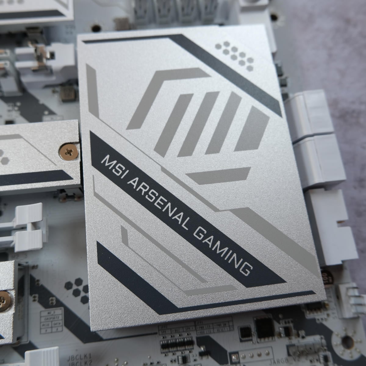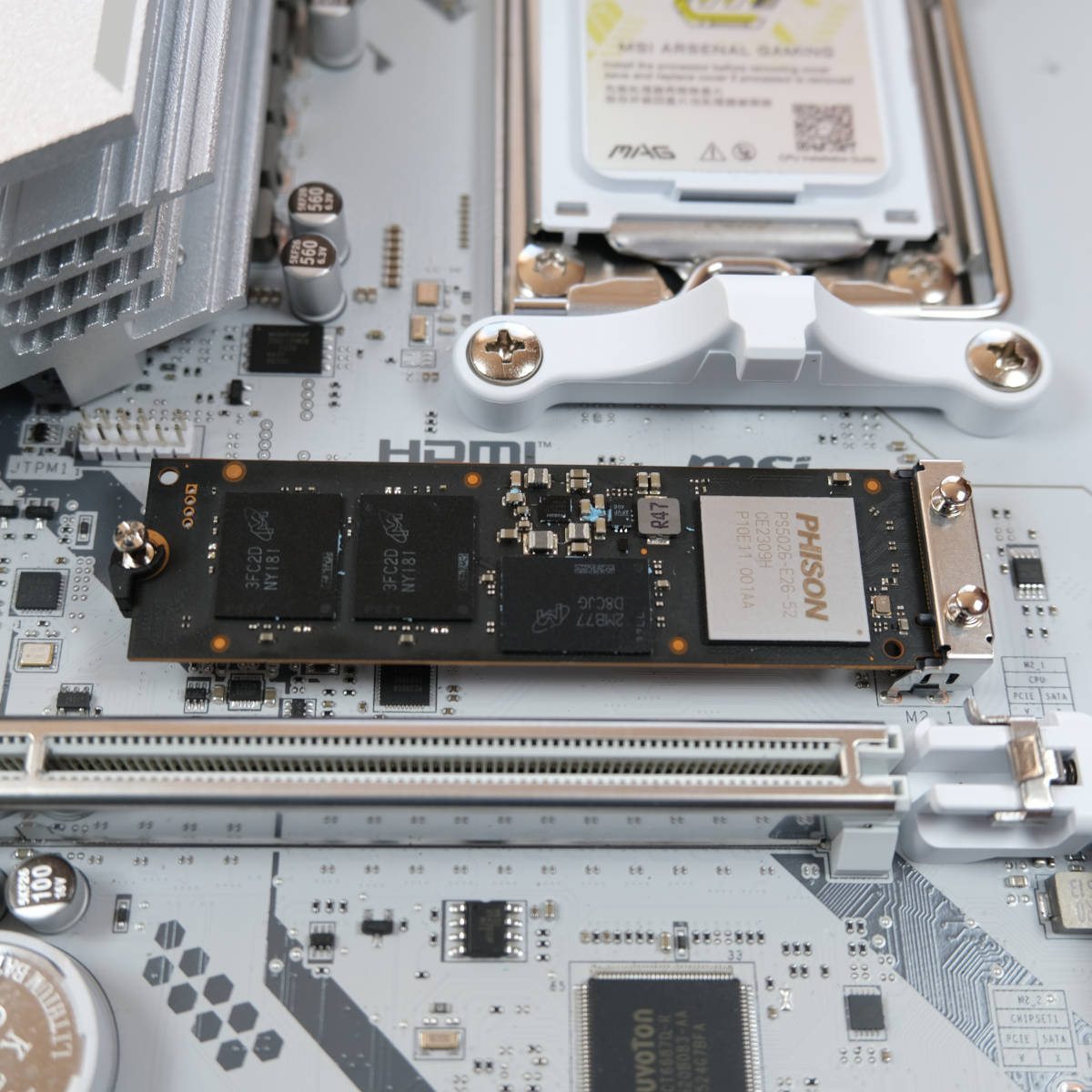 This new board arrives with a white PCB, complete with grey accents and MAG badging