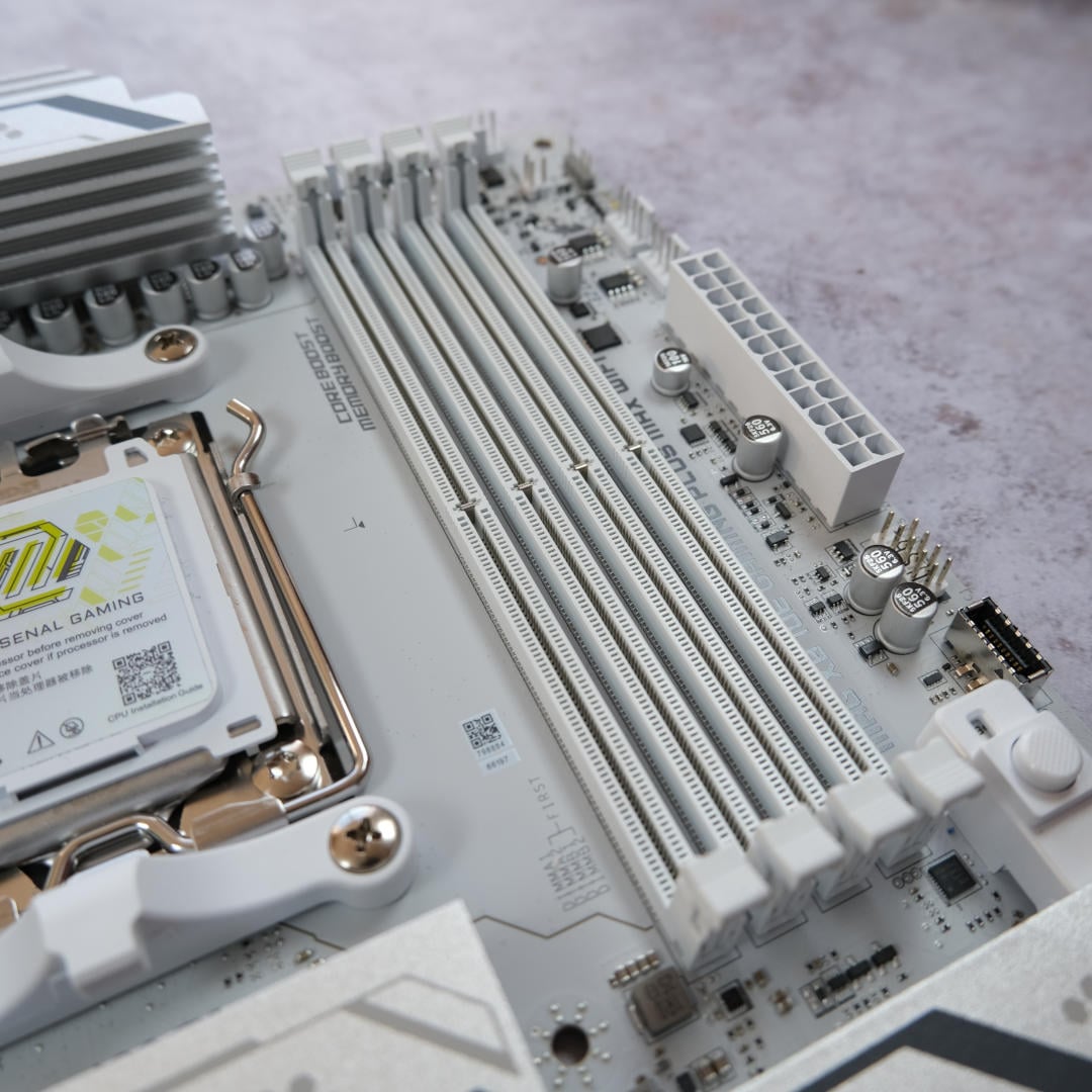 Next door there are four DIMM slots, supporting up to 256GB (4x64GB) of DDR5 RAM. Throw a single stick in there and the board will happily cheer it on running at 8,200MT/s.