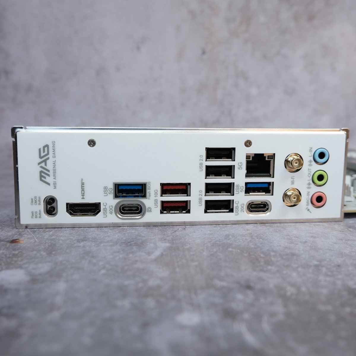 Round back, there’s a healthy amount of USB ports for the plugging. From the top down, the MAG X870E Gaming Plus Max WiFi features two USB-C ports, one 40Gb and the other 20Gb, as well as eight USB-A inputs (two 20Gb, two 10Gb, and four 480Mb).