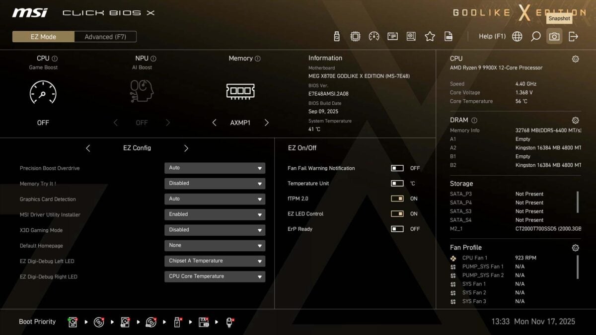 The ‘EZ Mode’ tab offers up plenty of useful at-a-glance system information. From here, you can quickly identify if the system is detecting your hardware and whether it’s running at the correct speed. You’ll also find convenient toggles for mainstay options such as A-XMP/EXPO memory profiles and Precision Boost Overdrive (PBO).