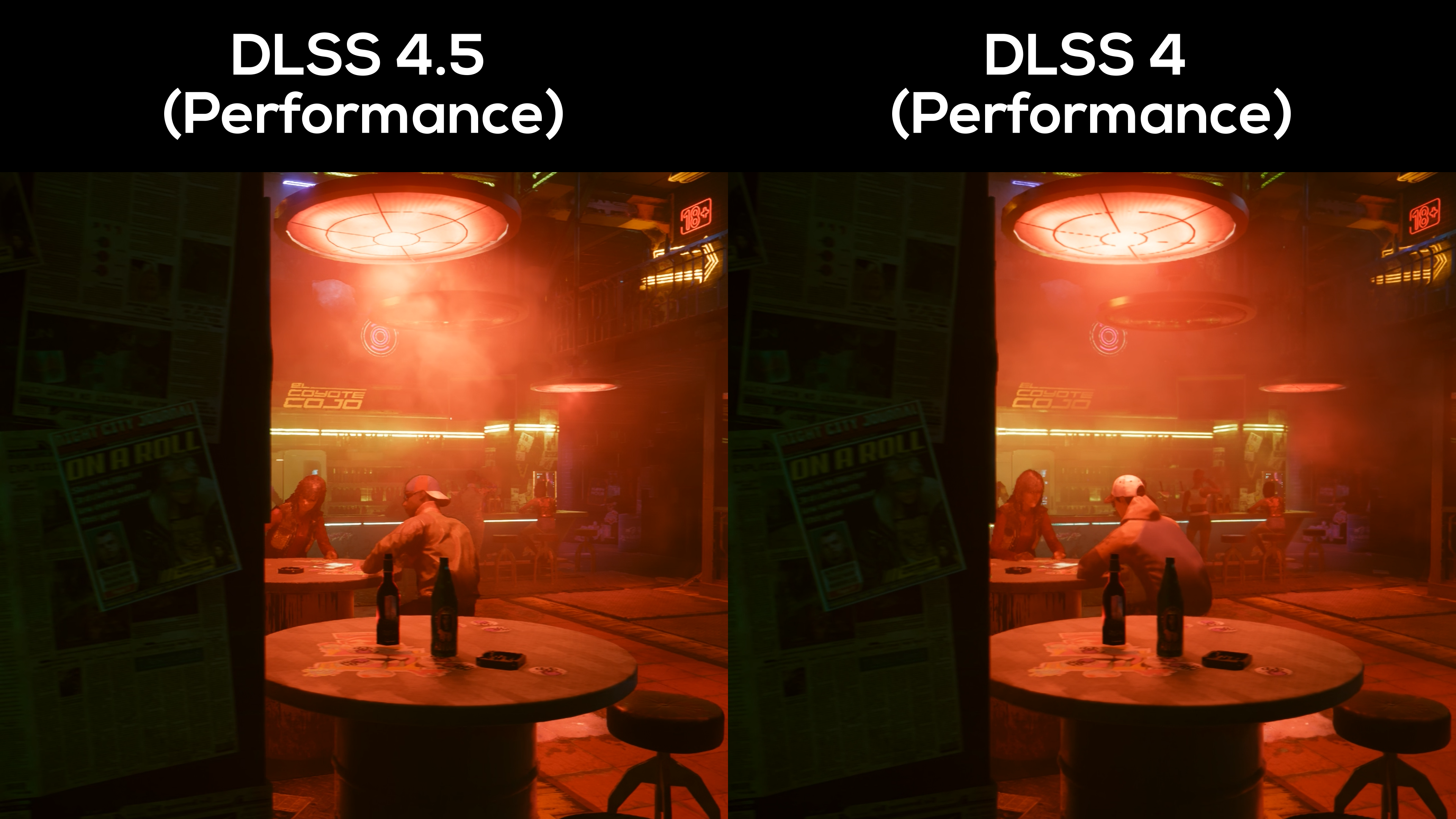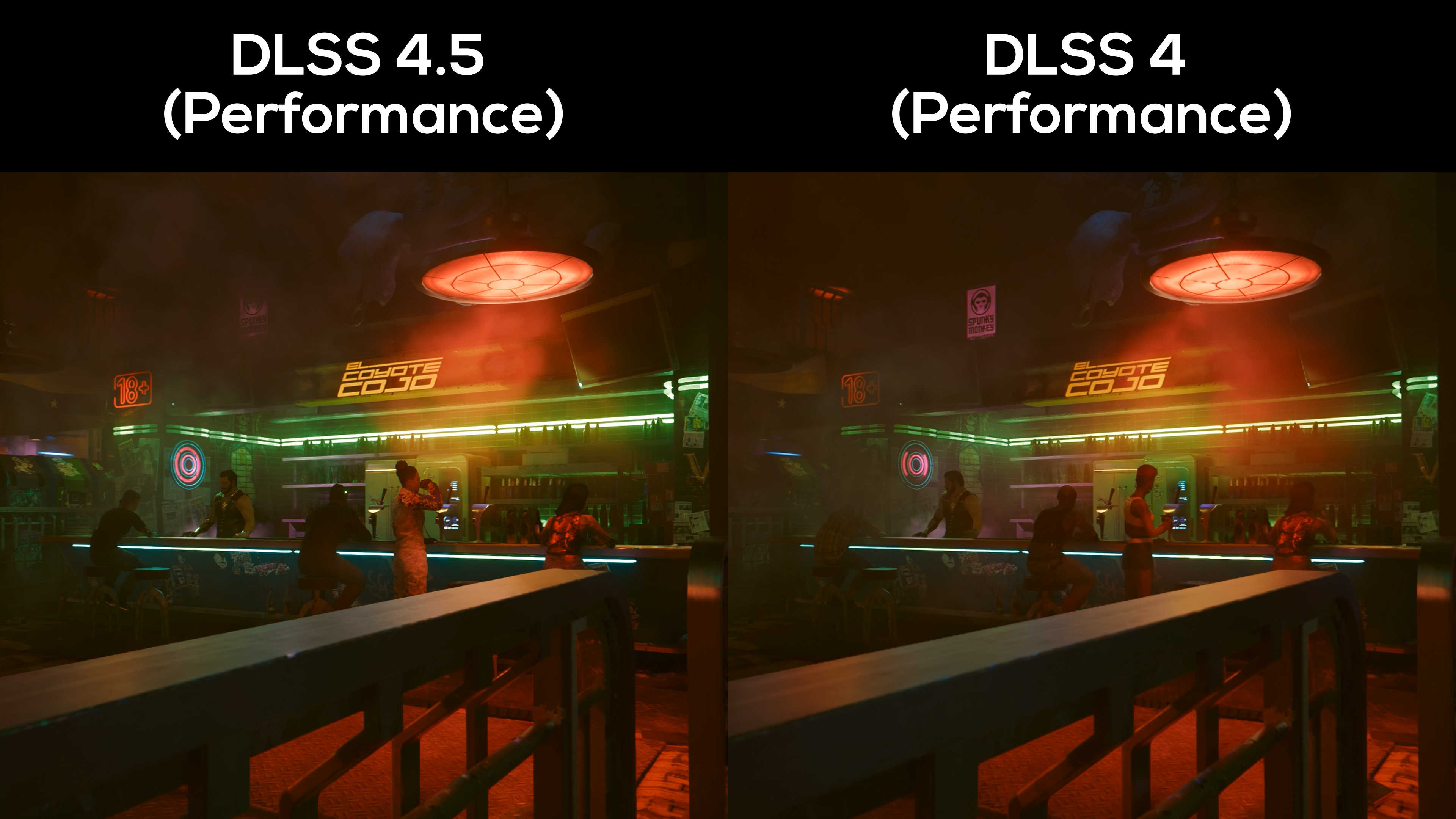 Again, light sources are brighter here too. Comparing the shine of the green LED strips at the back of the bar, DLSS 4.5 looks more true-to-life of a neon glow.