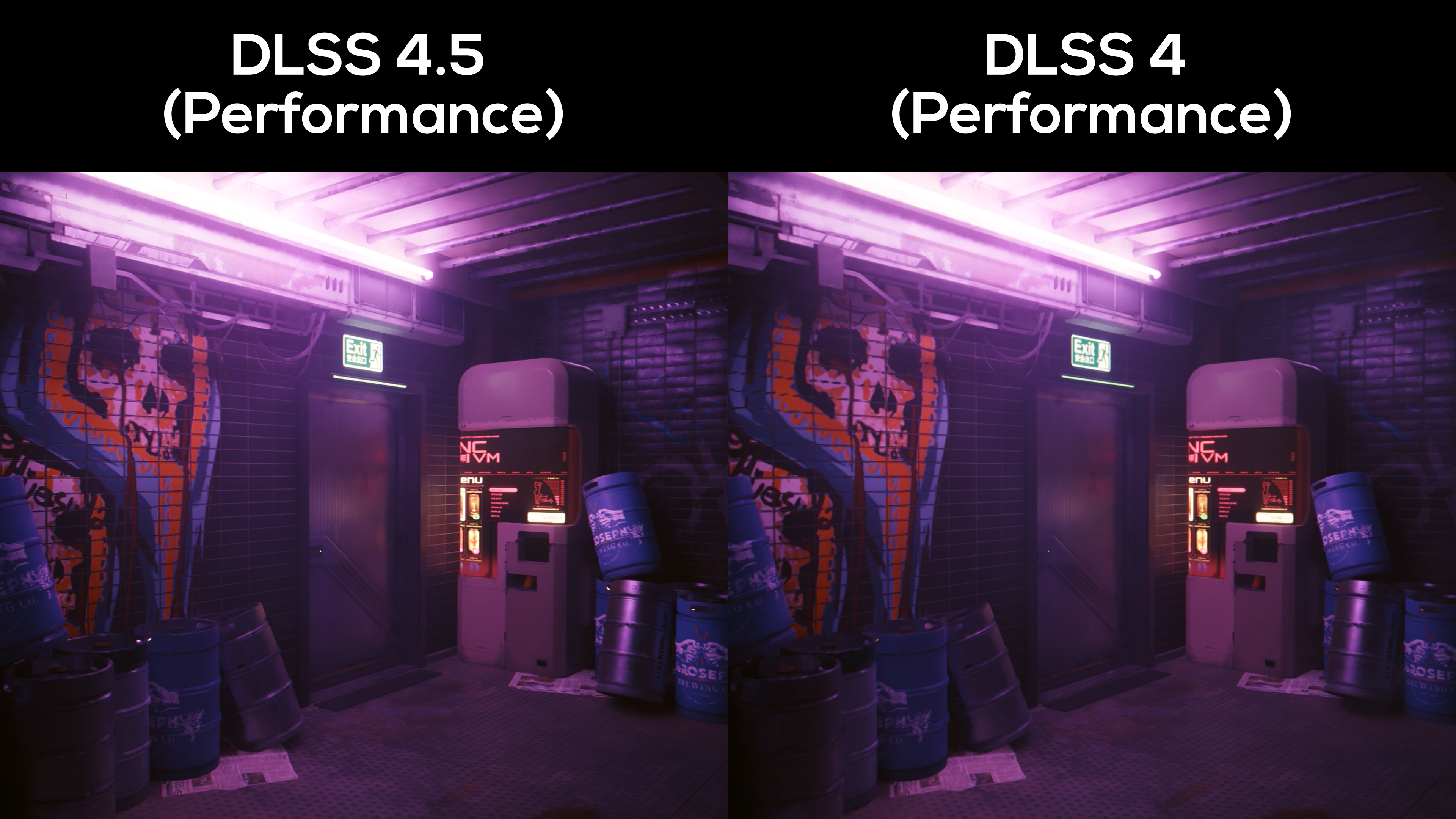 In this storeroom, the printed logo on the Broseph Brewing Co. barrels is sharper using DLSS 4.5, as is the text on the machine next to the exit. It’s a subtle effect but difficult to unsee once you’ve noticed it.