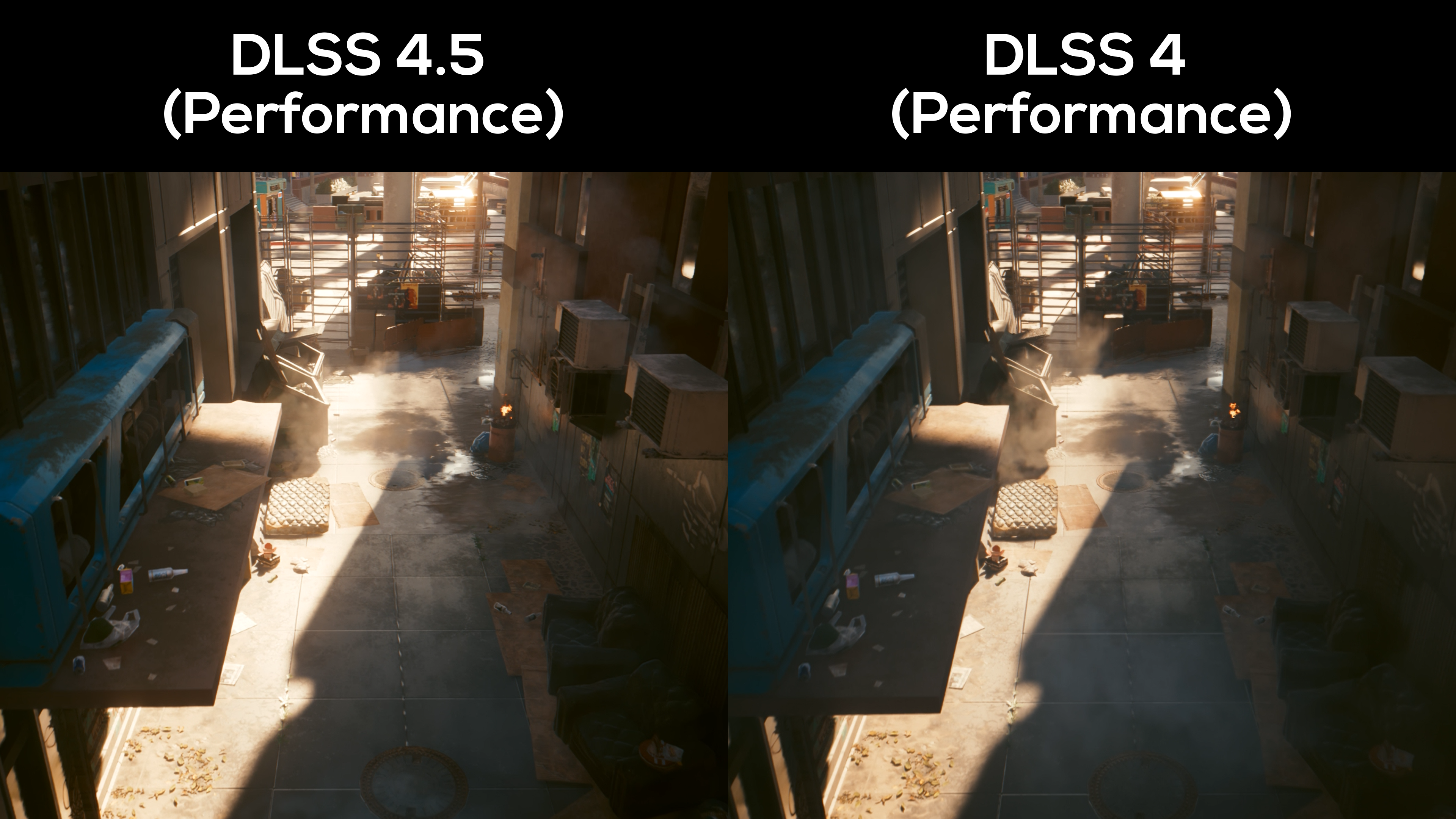 Assessing this alleyway from above, temporal instabilities in DLSS 4 rear their head as the older upscaler can’t settle on how to render the underside of the mattress as the camera pans towards it. DLSS 4.5 shows no such obvious shimmering, and more appropriately dulls line detail as it bakes in the sun.