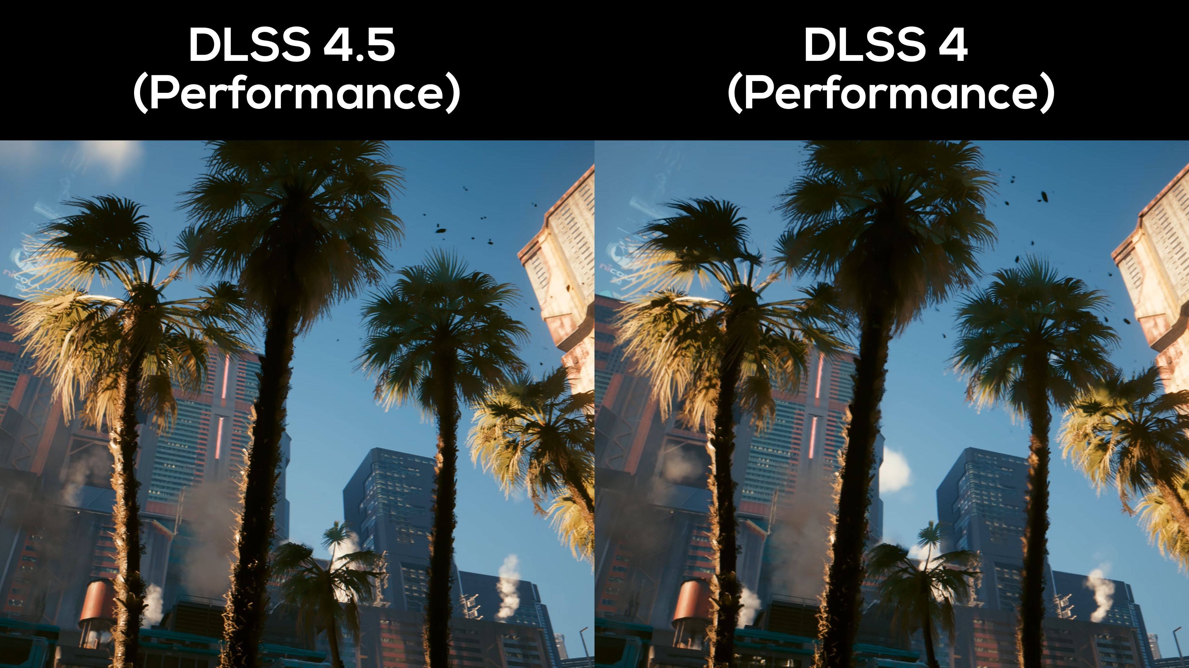 Finally, the most noticeable uplift you’ll find in this scene is in the temporal stability and anti-aliasing of the palm tress. Both bark and leaves are richer in detail, with less fringing and muddied textures.