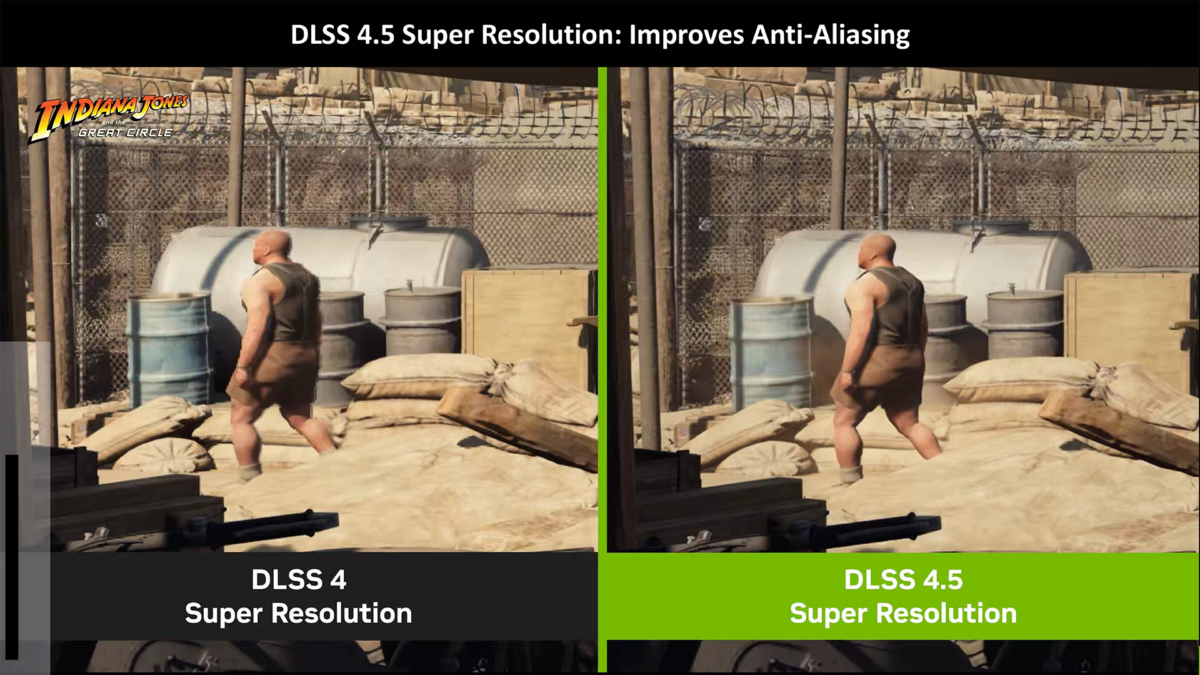 Finally, Indiana Jones and the Great Circle sees DLSS 4.5 Super Resolution offer appreciably better anti-aliasing. This is most noticeable along the edges of the NPC, as well as in the overall definition of the chain link fence. By contrast, DLSS 4 looks distractingly fuzzy.