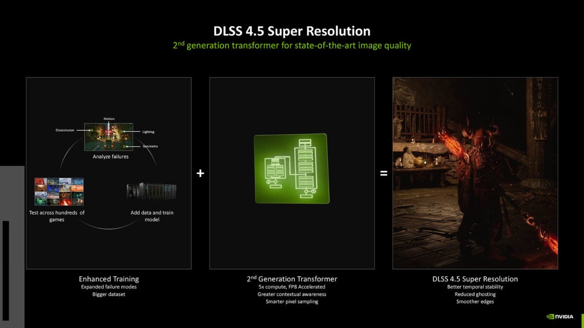 This more robust training regime provides DLSS 4.5 Super Resolution greater contextual awareness of game assets frame-to-frame, and can more smartly sample pixels for upscaling. In turn, you can expect better temporal stability, less ghosting, and improved anti-aliasing in real-world usage.