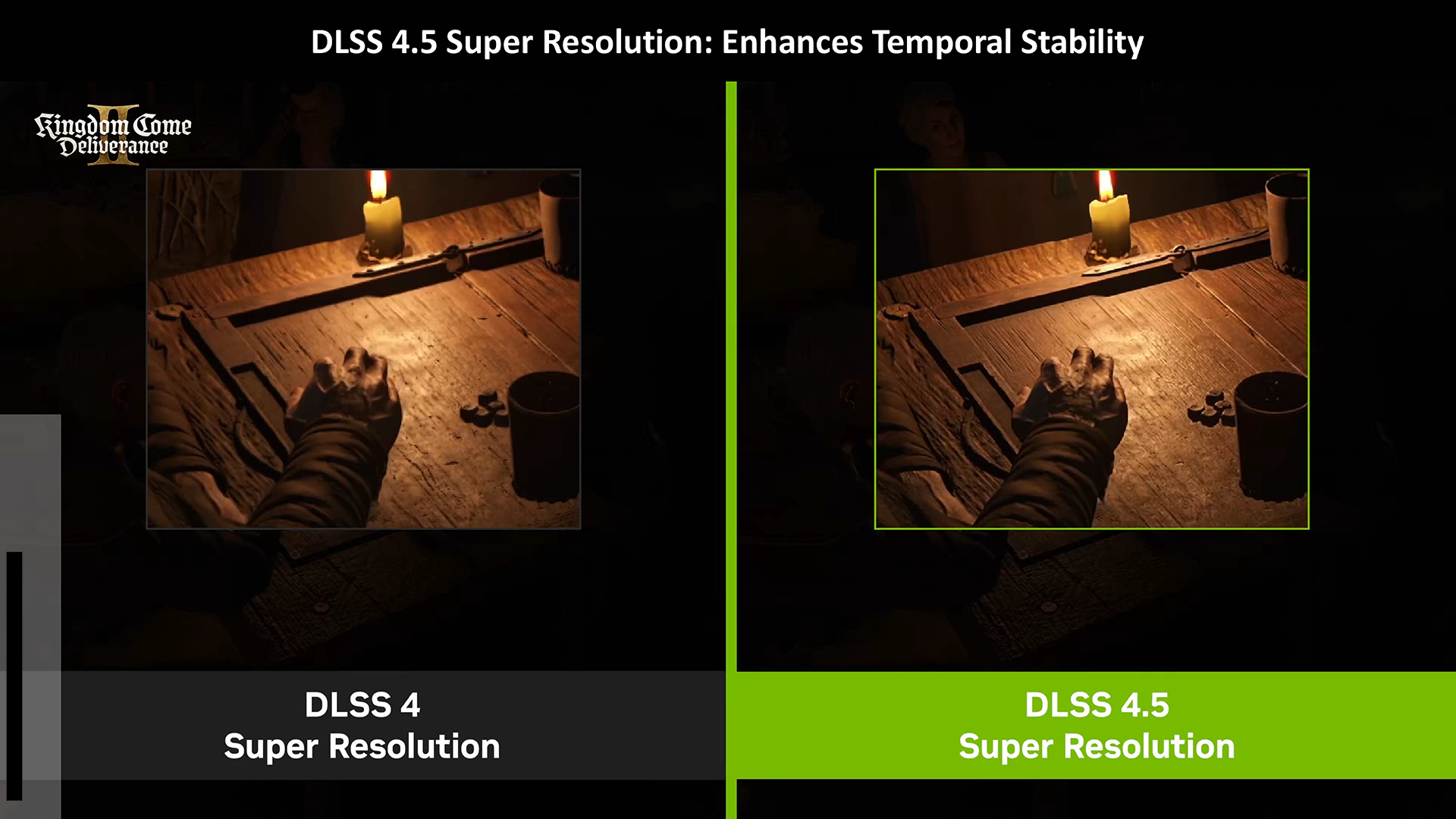 Nvidia has provided a few examples of DLSS 4.5 Super Resolution in action, highlighting the new version’s aforementioned improvements, complete with comparisons to DLSS 4. As you can see from the Kingdom Come: Deliverance II screenshots, the new model’s superior temporal stability nets a sharper image with greater retention of finer details like in the table’s woodgrain.